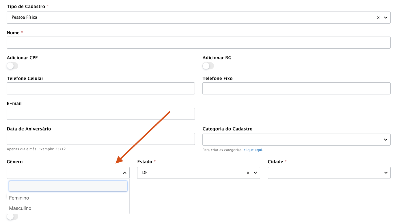 No menu principal, você encontra o módulo: Configuração >> Campo gênero (Cadastro)