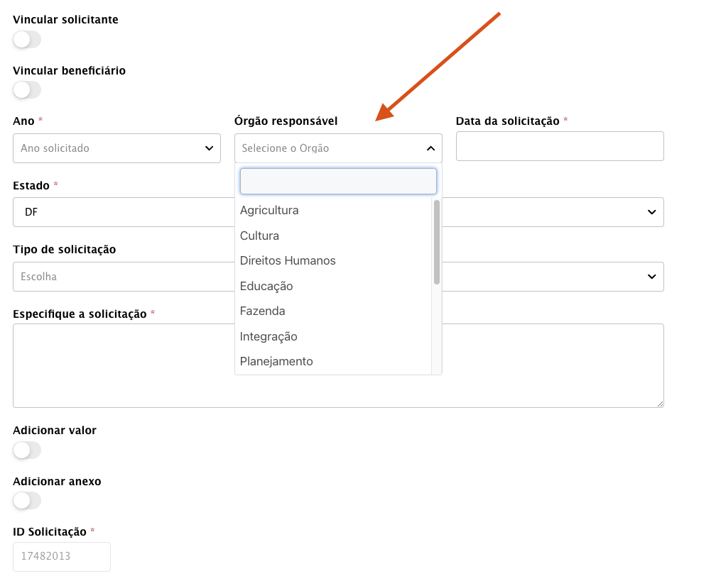 No módulo solicitações tem um menu onde carrega alguns órgãos pré-definidos pelo sistema. Veja: