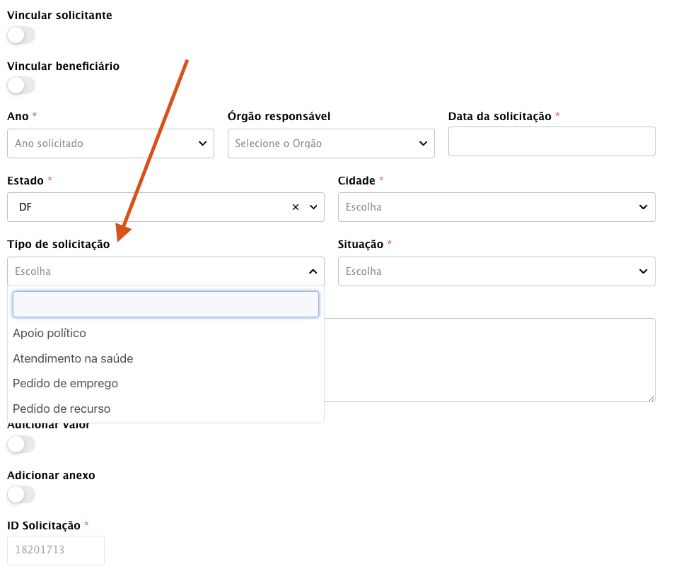 No menu principal você encontra o módulo: Configuração >> Campo tipo de solicitação (Solicitações)