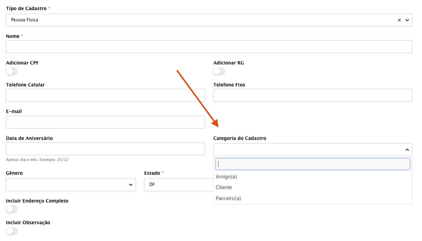 No formulário de cadastro consta um campo chamado categoria, veja: