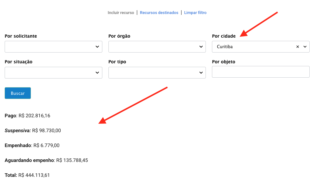 É possível ver o somatório dos recursos acessando a listagem de recursos destinados.