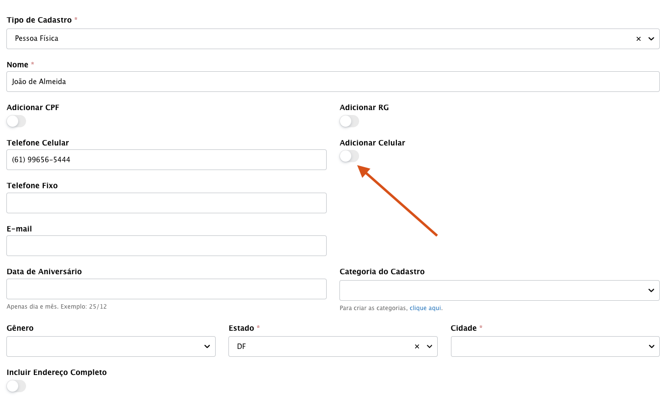 Após o preenchimento do número, aparecerá de forma automática o botão que permite a adição de novos números. Veja: Tela do formulário Esse botão aparecerá logo após a inserção do número de telefone. A mesma regra está aplicada aos campos Telefone fixo e e-mail. Temas: Cadastro