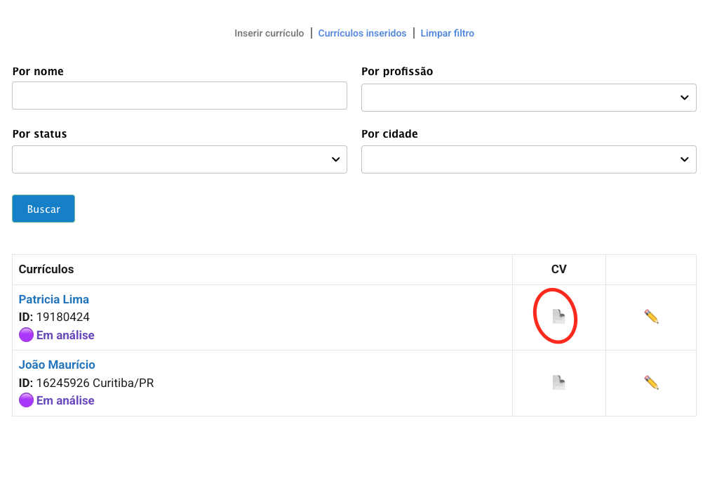 Tem duas formas de visualizar o currículo cadastrado. 1 – Pela listagem de currículos cadastrados, veja: Tela de currículos cadastrados 2 – Visualizando o detalhamento do cadastro do currículo, veja: Detalhamento do cadastro do currículo Temas: Anexo currículoVisualizar currículo